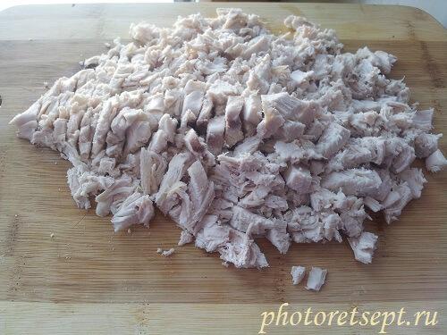 3. Курицу отварить. Охладить до комнатной температуры. Нарезать кубиками.