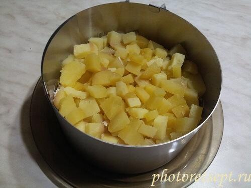 8. Затем выкладываем картошку, нарезанную кубиками.