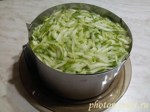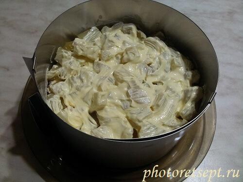 Собирать салат проще в специальном разъёмном салатном кольце. Однако можно сделать это просто на плоской тарелке. Слои идут в таком порядке: