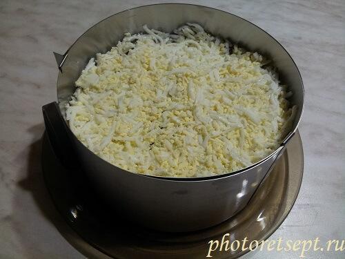 11. Яйца натрите на средней или крупной терке, выложите в салатник.