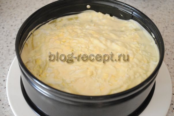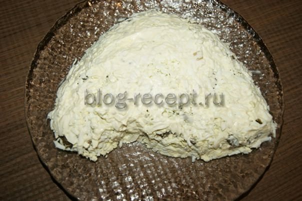 - дальше следует слой яиц и смазывается майонезом, немного тертых белков заранее необходимо оставить, чтобы украсить салат;