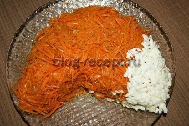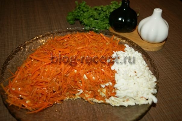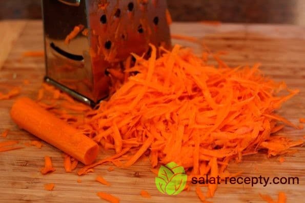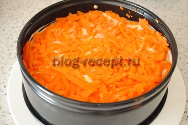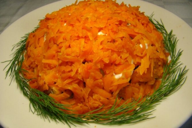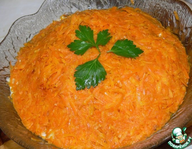 - Завершающим слоем идет обжаренная до полуготовности морковь. Ее тоже стоит покрыть тонким слоем майонеза. Затем следует убрать салат в холодильник для пропитки. Перед самой подачей закуску украшают в произвольном порядке.