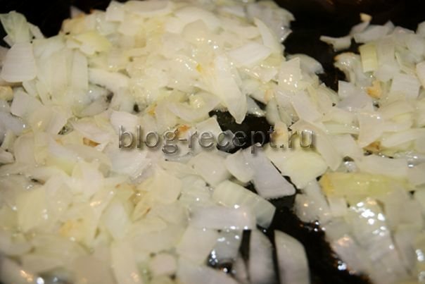 Чистим лук, мелко шинкуем и обжариваем до прозрачности на раскаленной сковороде.