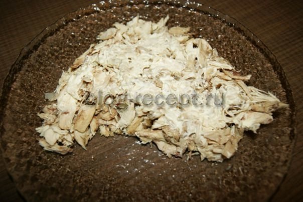 - первой кладется курица и смазывается тонким слоем майонеза;