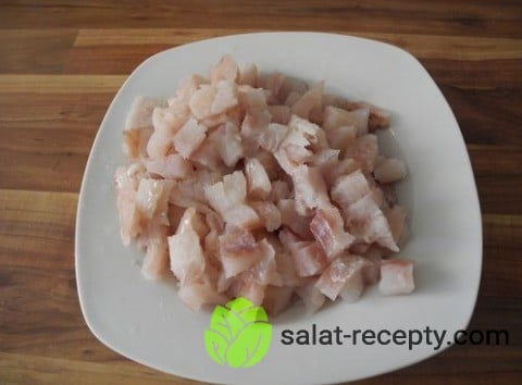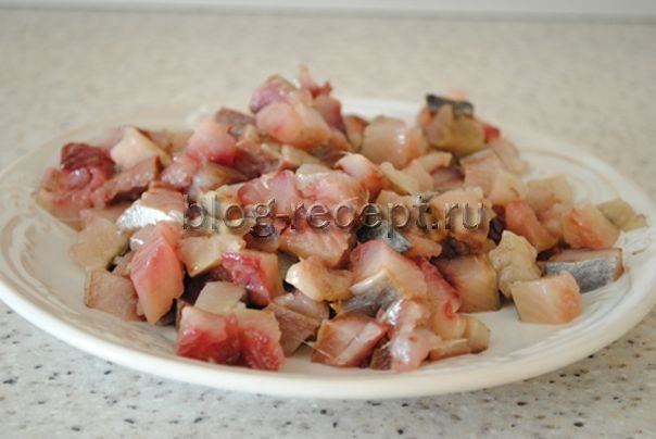 - Чистим сельдь, отделяем от косточек и нарезаем кубиками.
