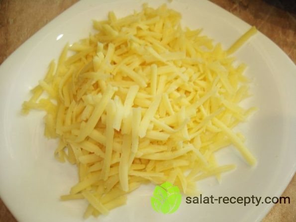 Сыр, потертый на крупной терке. Этот слой смазываем майонезом.