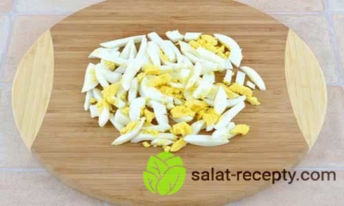 Кипятим воду, помещаем в нее яйца и варим в течение 12 минут вкрутую. Сливаем кипяток, заливаем на 7 минут холодной водой. Затем очищаем и нарезаем соломкой.