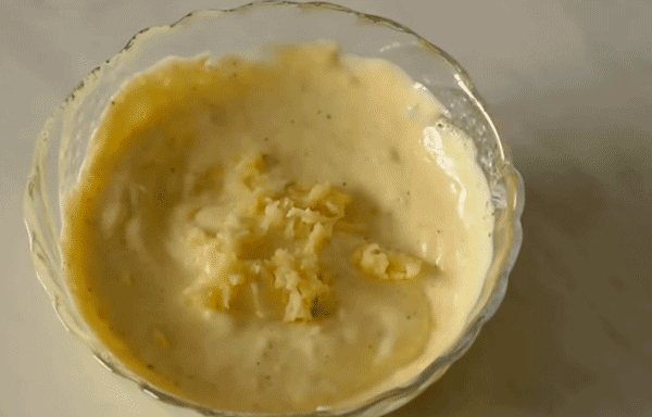4. Майонез перемешайте с пропущенным через чеснокодавку чесноком, посолите и поперчите. Выложите в миску.