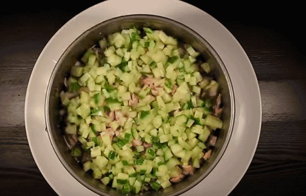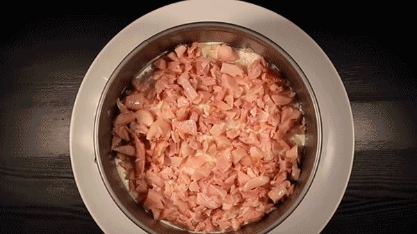 - К ней добавьте нарезанную небольшими кубиками куриную грудку,