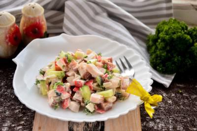 Этот простой рецепт салата предлагает приятное сочетание копченой курицы с авокадо, помидорами, оливковым маслом и другими компонентами.