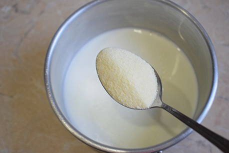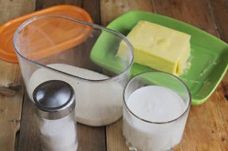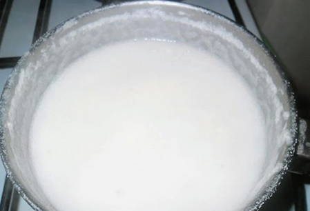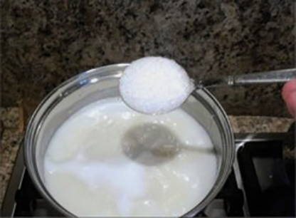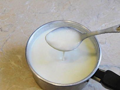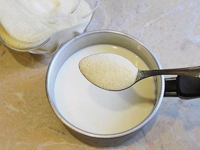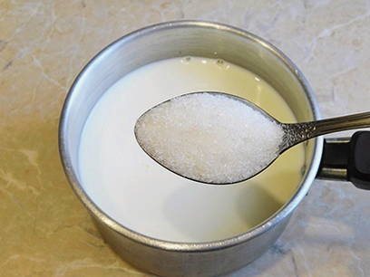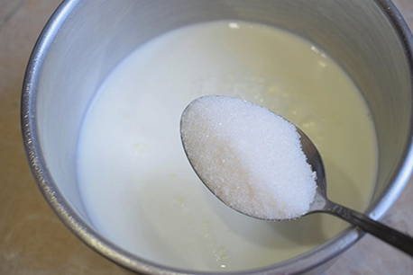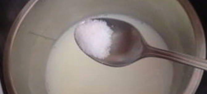 - Наливают в посуду молоко или воду, добавляют соль и сахар, перемешивают.