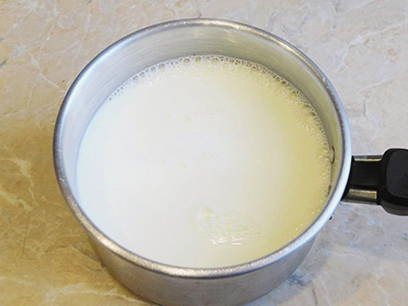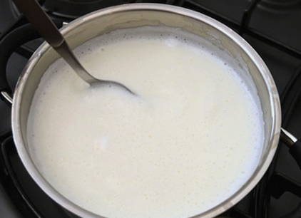 - В кастрюлю влейте молоко, поставьте его на огонь и доведите до кипения.