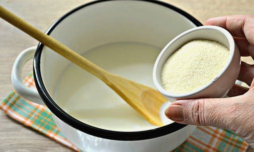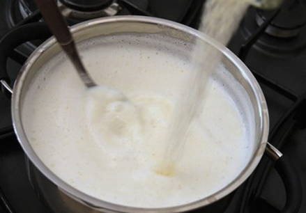 Крупу следует всыпать тоненькой струйкой в молоко, которое уже закипело. При засыпании необходимо энергично размешивать массу при помощи круговых движений.