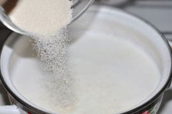 - В отдельной емкости смешайте манную крупу и сахар. полученную смесь всыпьте в молоко.