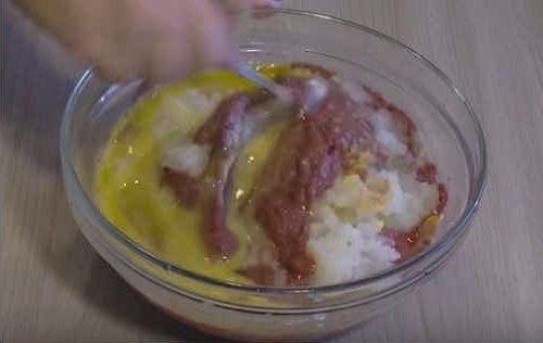 5. Далее все подготовленные ингредиенты – обжаренные с луком грибы, яйца, муку, специи, соль, перемешиваем, оставляем на 30 минут.