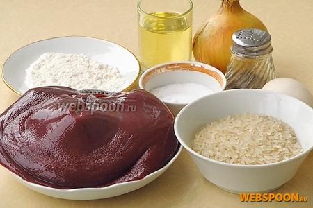Для приготовления оладий нужно взять говяжью печень, репчатый лук, яйца, рис, пшеничную муку (1 ст. л. с горкой), растительное масло, молотый чёрный перец и соль.