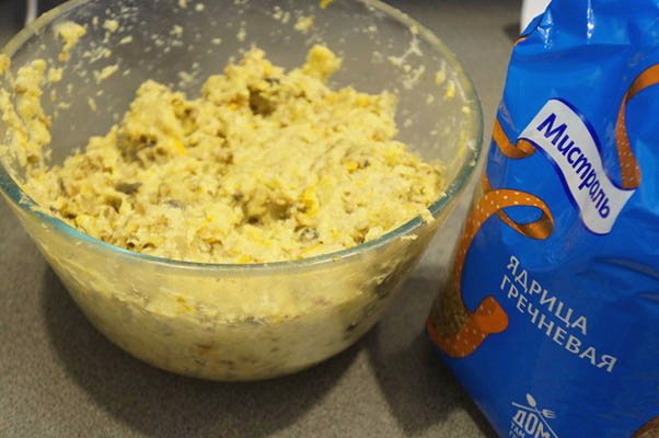 - Смешайте рыбный фарш с куриным яйцом, размоченным хлебушком, солью и специями.