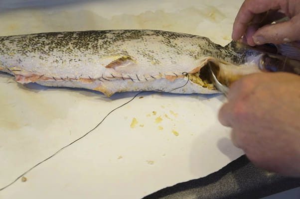 Выложить полученный фарш в шкуру щуки и аккуратно зашить отверстие. Завернуть щуку в 2-3 слоя марли и опустить ее в горячий бульон. Варить 25-30мин. на медленном огне.