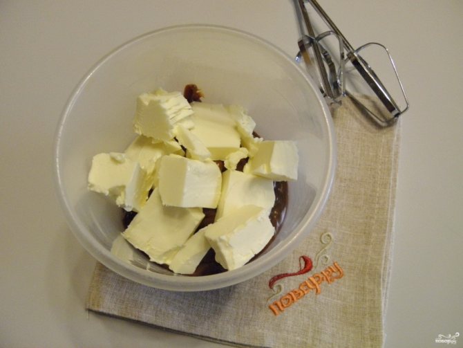 - К маслу постепенно добавляют шоколадную массу и каждый раз хорошо замешивают все вместе венчиком или миксером.