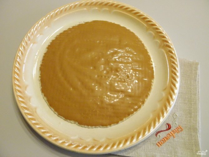 - Приготовьте тарелку для торта и 8 вафельных коржей. Первый корж смажьте приготовленным кремом с одной стороны и выложите на тарелку сухой стороной вниз.
