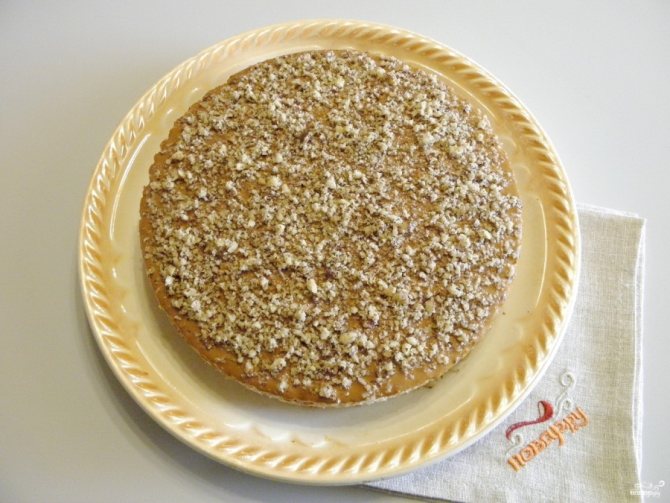 - Орехи добавляют в массу или посыпают каждый корж на этапе смазывания. Часть орехов оставляют, чтобы обсыпать верхний слой коржей.