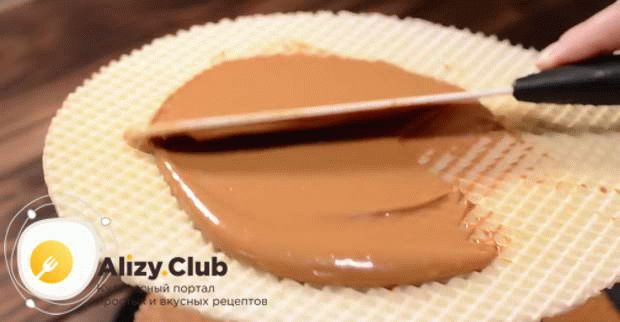 - Смажьте вафли, уложите слоями и ненадолго поставьте блюдо в холодильник.