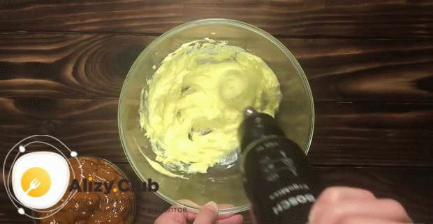 - В отдельной посуде размякшее масло взбивают до пышной консистенции при помощи миксера или венчиком. На этот процесс уходит 5-7 мин.