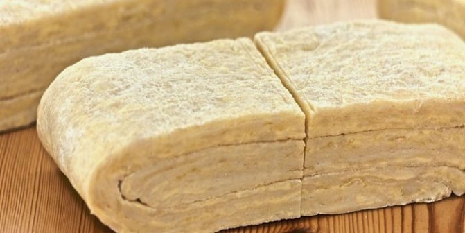 Первый вид – классическое слоеное тесто. Для его приготовления используют воду и муку в равных пропорциях. Его используют для приготовления сырных палочек, разнообразных пирожков и коржей.