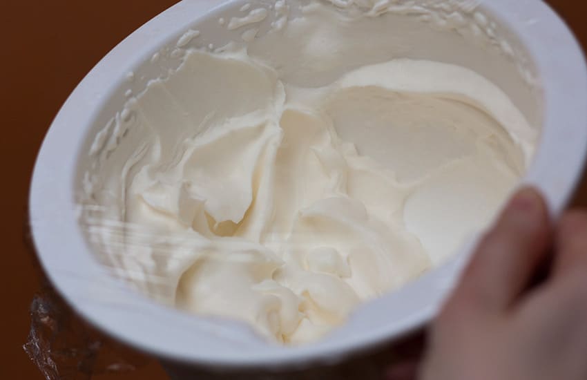 Молочный продукт от 10 до 22% жирности очень плохо загустевает. Получить из него густую смесь, которая держит форму будет более хлопотно. Потому что он имеет недостаточно жира, чтобы сформировать необходимые пики. Ситуацию можно исправить, если растворить 1,5 ст.л. желатина в 100 мл воды. Растворенный желатин комнатной температуры добавляют в смесь для загустения.