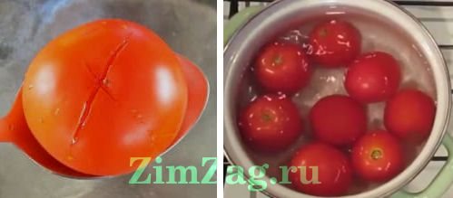- Томаты хорошо вымыть, переложить в кастрюлю и залить кипятком. Спустя 2-3 минуты переложить их на блюдо, аккуратно удалить кожуру. Неплотно уложить в стерилизованную банку.