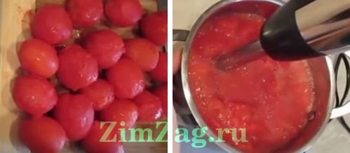 - Или, обдав помидоры кипятком, снимите с них кожицу, порежьте на куски и проварите несколько минут, а затем протрите через сито. Это займёт немного больше времени, но результат того стоит.