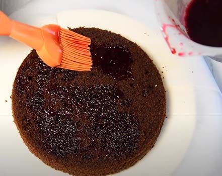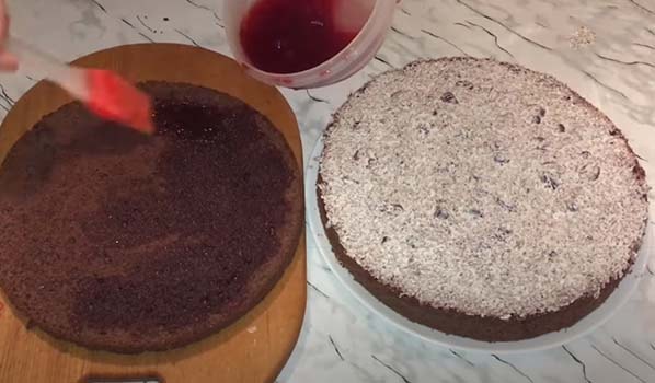 Сверху накрываем коржом, который пропитываем кофе. Верх и бока Шварцвальдского торта смазываем кремом.