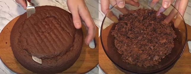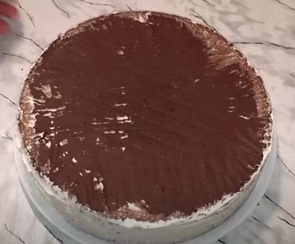 Бока торта обсыпаем бисквитной крошкой. Снова ставим его охладиться на 15 минут, чтобы глазурь немного застыла.