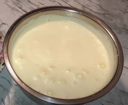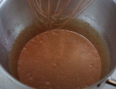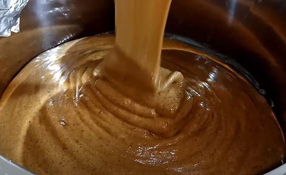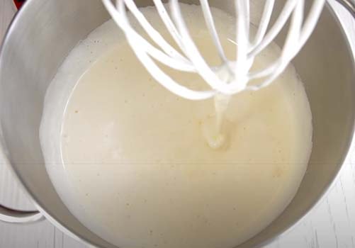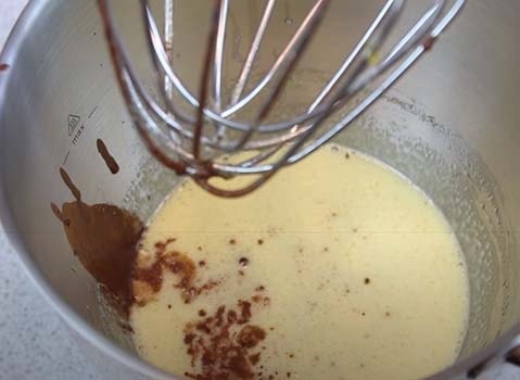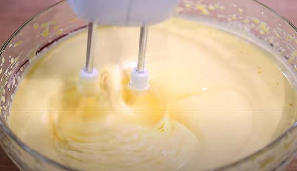 Тонкой струйкой вливаем его в сметанную смесь, не переставая взбивать миксером.