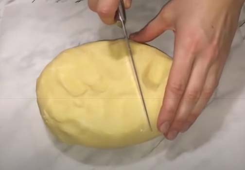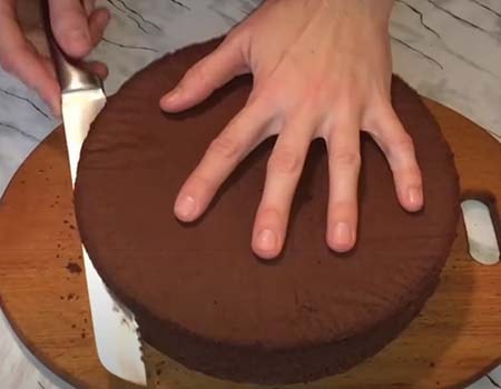 9. Готовый корж остудите как следует и аккуратно разрежьте поперек на два коржа.