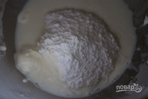 Сметану взбиваем миксером, всыпая порциями сахарную пудру.