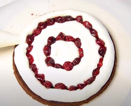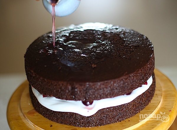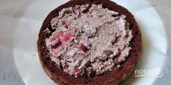 11. Выложите корж и полейте сиропом. Затем — слой крема и вишни, которые предварительно немного обсушите от сиропа.