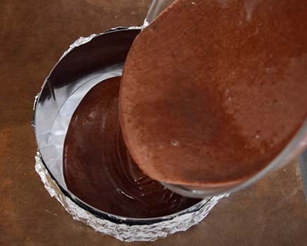 Форму для выпекания застилаем пергаментной бумагой. Выливаем в нее шоколадное бисквитное тесто. Отправляем его в заранее прогретую до 180° духовку на 40-50 минут.