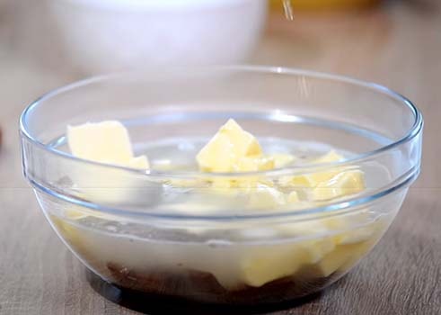 В другую миску кладем шоколад, сливочное масло и заливаем горячей водой. Перемешиваем до однородности.
