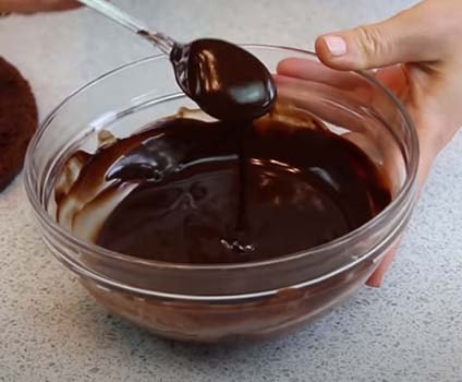 За это время готовим шоколадную глазурь. Растапливаем на водяной бане сливочное масло вместе с шоколадом. Даем массе немного остыть и покрываем ею торт.