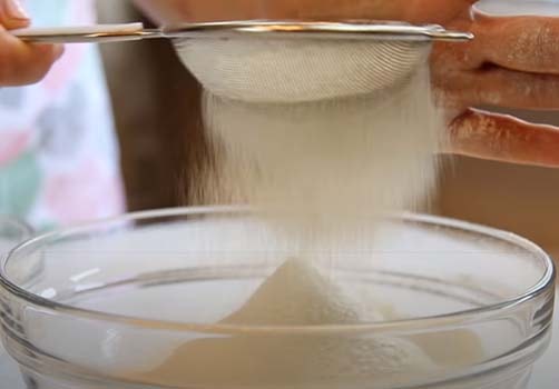 Смешиваем муку, какао-порошок, крахмал и разрыхлитель. Полученную сухую массу просеиваем через сито.