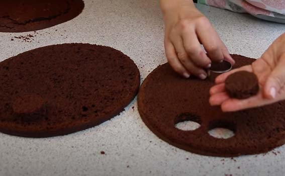У бисквита срезаем верхушку и разрезаем на два коржа.