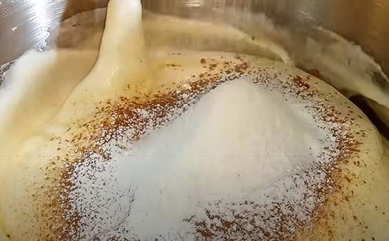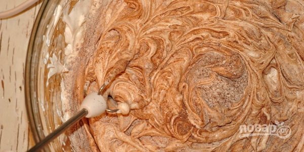 В один прием высыпаем сухую смесь и все хорошо перемешиваем. Долго взбивать не надо, чтобы масса не осела.
