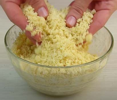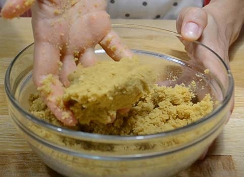 Хорошо перемешиваем, чтобы она вся равномерно пропиталась. Крошка должна быть полностью влажной и при сжимании в руке собираться в комок.