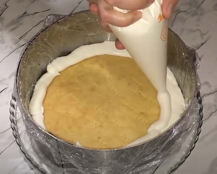 Готовый сметанный мусс выкладываем на песочную основу. Разравниваем его, накрываем пленкой и ставим в холодильник на 2-3 часа.