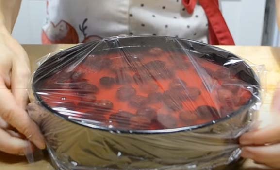 Достаем из холодильника торт и выкладываем вишню на муссовый слой. Аккуратно заливаем желатиновым соком. Накрываем пленкой и ставим на холод на 6 часов.