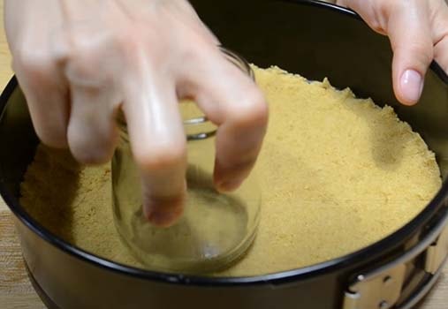 Форму застилаем бумагой и выкладываем крошку. Разравниваем ее и слегка утрамбовываем. Удобнее всего это делать дном стакана. Ставим основу в холодильник.