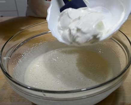 Аккуратно добавляем в яичную смесь, промешивая лопаточкой снизу-вверх. Делайте это не спеша, чтобы масса тесто не осело.