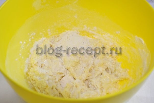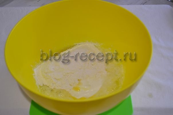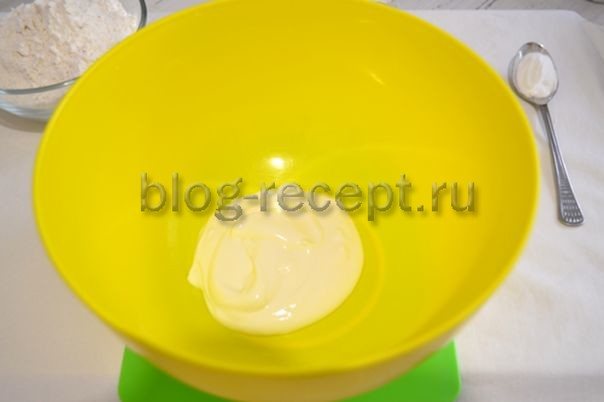 - В чашку к маслу добавить все остальные продукты: сметану, яйцо, соду. Постепенно аккуратно всыпать муку. Массу посолить;
