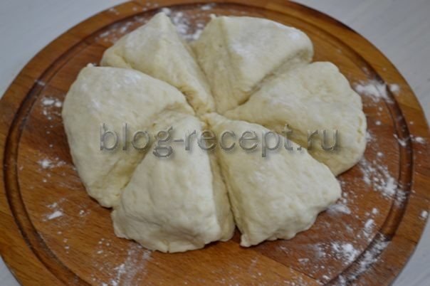 - Из теста раскатывают несколько лепешек и каждую делят на 8 сегментов.